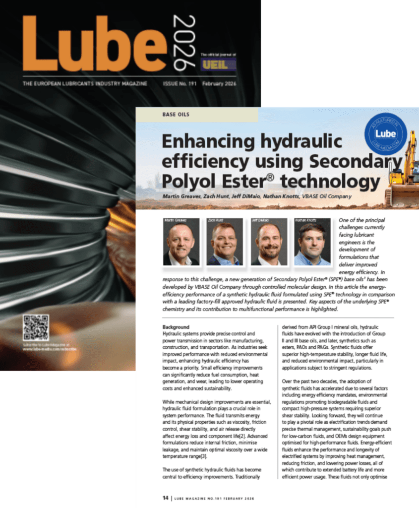 VBASE Oil Company is proud to announce the publication of Enhancing hydraulic efficiency using Secondary Polyol Ester® technology” in Lube Magazine, Issue 191 (February 2026). Published by Lube Media, Lube Magazine is a respected European technical journal serving lubricant formulators, base oil specialists, and OEM professionals worldwide. In the article, Dr. Martin Greaves, CTO; Dr. Jeff DiMaio, CEO; Dr. Nathan Knotts, Senior Formulator and Innovation Scientist; and Zach Hunt, Senior Applications Specialist, present independent third-party testing conducted at the Fluid Power Institute at the Milwaukee School of Engineering comparing a hydraulic fluid formulated with SPE® technology to a leading factory-fill mineral oil reference fluid.
